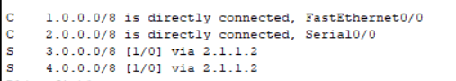 Router>en Router#conf t Router(config)#ho R1 R1(config)#int f0/0 R1(config-if)#ip add 1.1.1.2 255.0.0.0 R1(config-if)#no sh R1(config-if)#ex R1(config)#int s0/0 R1(config-if)#ip add 2.1.1.1 255.0.0.0 R1(config-if)#no sh Router>en Router#conf t Router(config)#ho R2 R2(config)#int s0/0 R2(config-if)#ip add 2.1.1.2 255.0.0.0 R2(config-if)#no sh R2(config-if)#ex R2(config)#int s0/1 R2(config-if)#ip ..