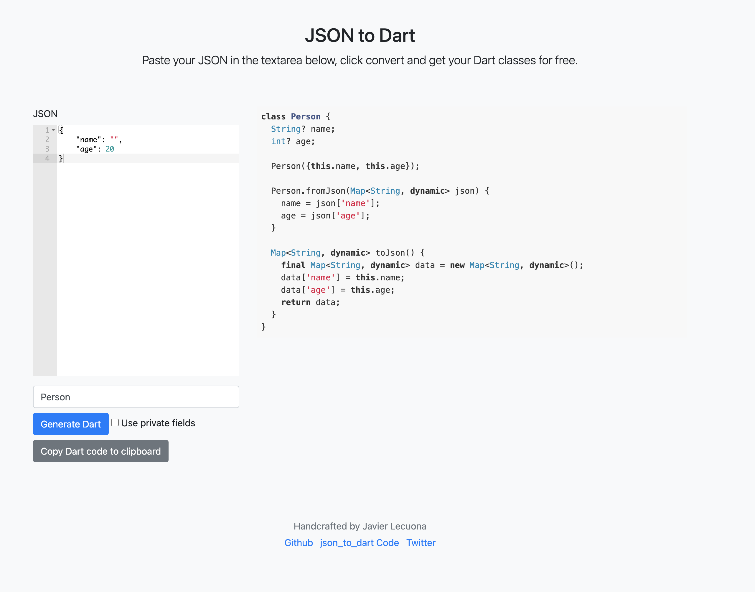 iOS로 개발하기로 해놓고 냅다 flutter 다시하기,,, 한입으로 두말하기 넘 자연스럽다~ .fromJson, .toJson 함수로 일일이 맵핑하기에는 좀,,,,,, 귀찮다.. 라이브러리가 있지만, 솔직히 소규모는 필요없다.. 개인개발자들에게는, 그리고 라이브러리,, 가 더 귀찮은 나 같은 개발자 json을 넣으면 Model 객체를 생성해주는 서비스가 많은데 dart라고 없을까..! Json 값을 넣으면 dart 모델 생성할 수 있다. https://javiercbk.github.io/json_to_dart/ JSON to Dart JSON to Dart Paste your JSON in the textarea below, click convert and get your Dart classes for..